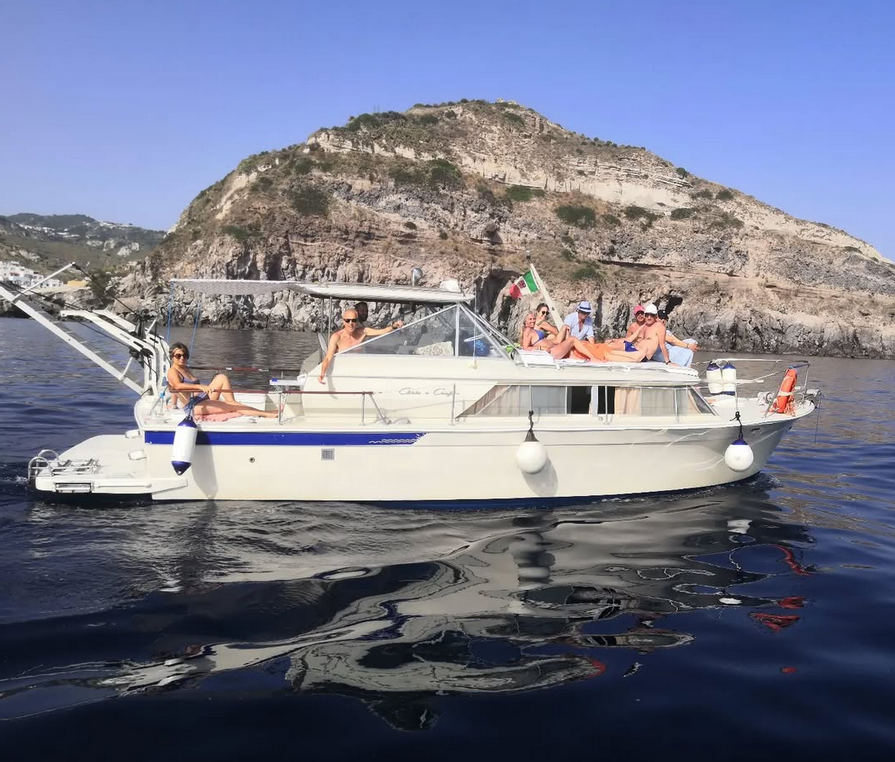 Salpa dal Porto di Forio a bordo del Mare Sup, storica Cris Craft Commander 31 del 1974. Una barca dal fascino classico, spaziosa e confortevole, perfetta per vivere una giornata in mare in compagnia di altri appassionati (max 10 persone).